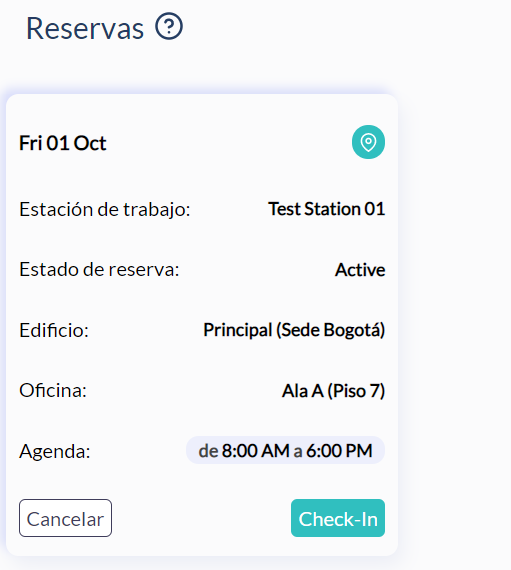 3. Verás todas tus reservas, cada una de ellas con la información correspondiente de: Estación de trabajo reservada, lugar, fecha y hora: